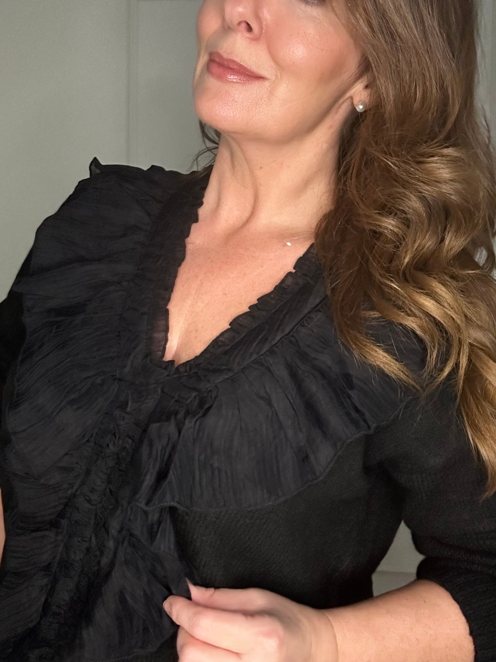 The Camille gives all the French vibes! The delicate ruffled V neckline help to make this the perfect jeans and a nice top moment.